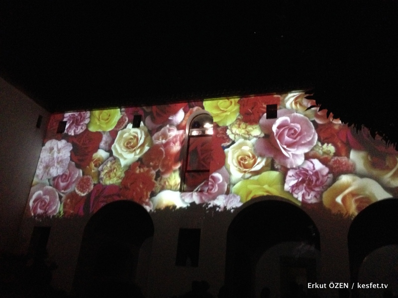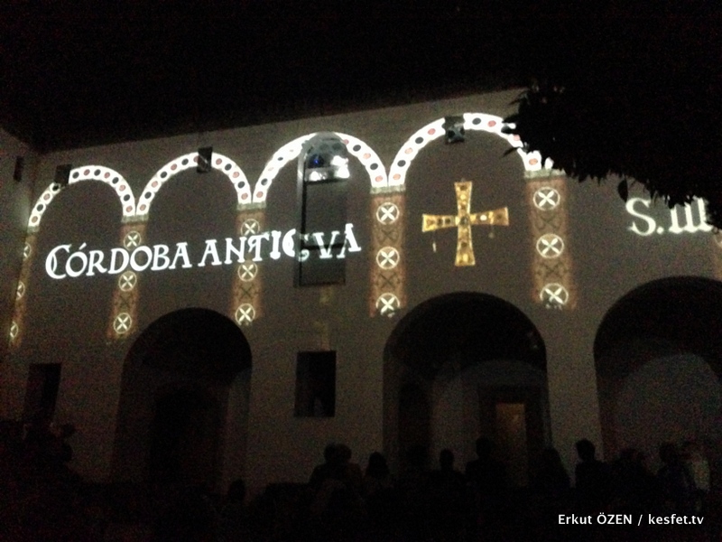 Gösteri için girişler bir hayli yoğun oluyor. İçeri girdikten sonra önce avluda bulunan minderlere oturup, etrafı çeviren beyaz duvarlar üzerinde Cordoba’nın tarihini anlatan dijital bir gösteri ve film gösterimi yapılıyor.