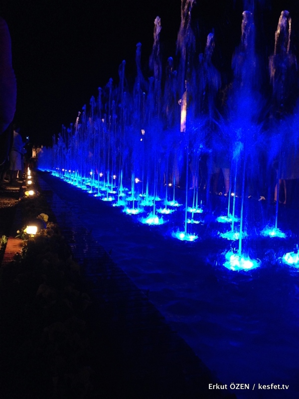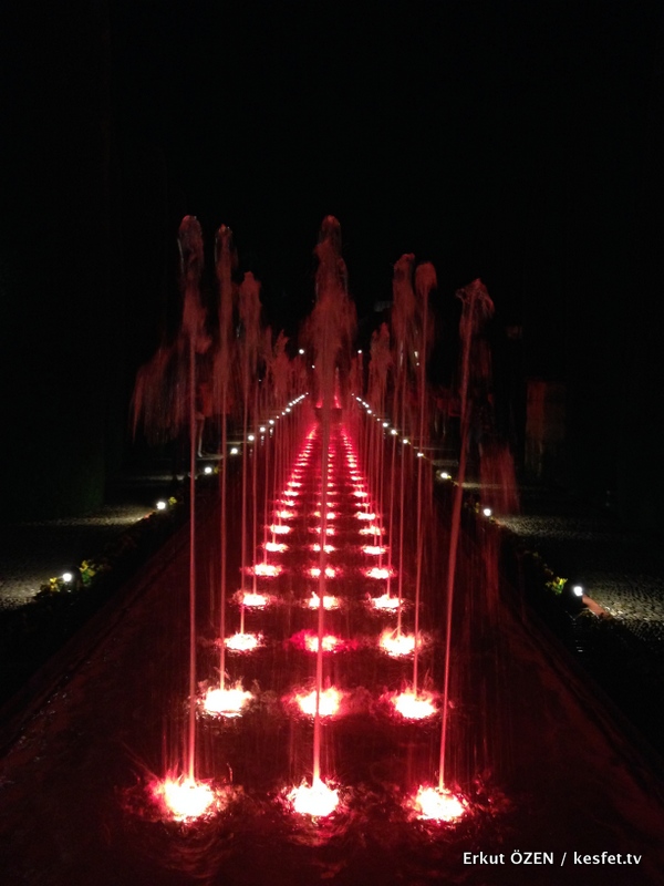 Ses ve müzik efektleri ile desteklenen bu filmden sonra da sizi yönlendirerek, bahçede bulunan fıskiyelerin ışık ve müzikle yaptığı harika dans gösterisini seyrediyorsunuz.