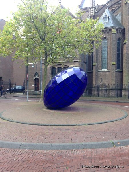 Meydana, Yeni Kilise tarafından gelirken (eğer araç ile geliyorsanız belirli araçlar ve izinli turist gruplarına ait araçlar dışında trafiğe kapalı) hemen kilisenin meydana açılan köşesinde mavi bir obje göreceksiniz. Bu Delft şehrinin simgelerinden sayılan Delft Mavisi olarak adlandırılan ve kentin ünlü porselenlerine ithaf edilen bir sembol anıt.