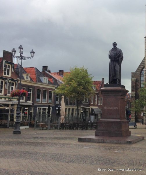 Meydanın ortasında göreceğiniz heykel, Delft doğumlu ünlü Hollandalı düşünür ve hukukçu Hugo Grotius‘a ait.