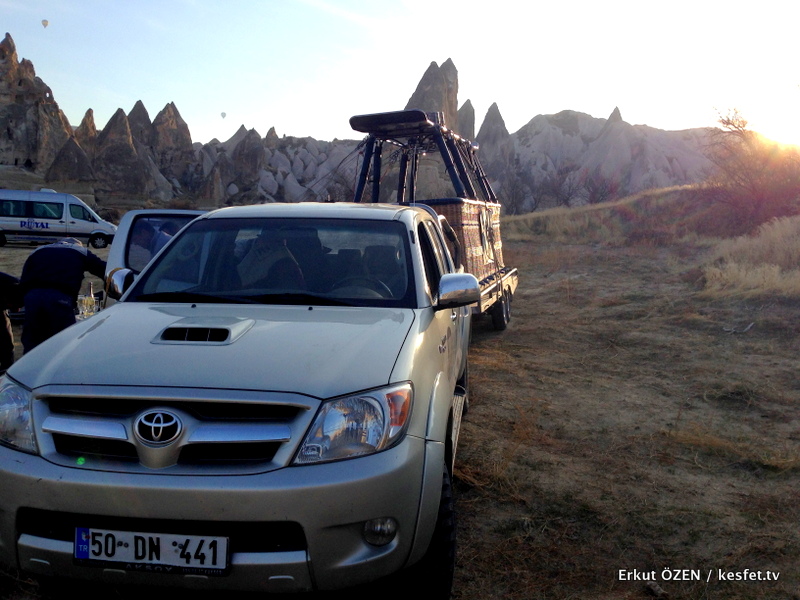 Büyüleyici bir alana yayılmış renk renk balonların içine verilen sıcak havalar, alacakaranlıkta duran balonları adeta ışıklı birer reklam tabelasına dönüştürüyor. Vadinin hemen her yerinden gelen benzer görüntüler eşliğinde benim de katılacağım uçuşun kalkış yapacağı noktaya doğru yaklaşık 15 dakika araçla devam ettik.