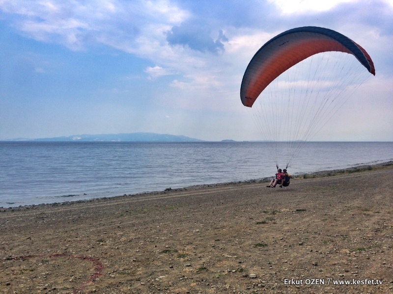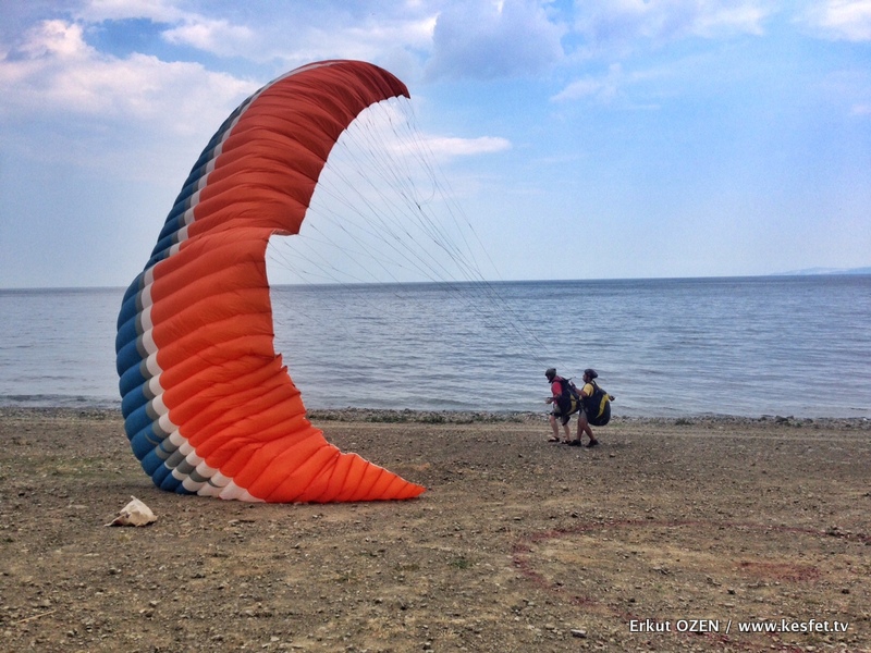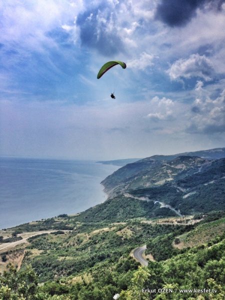 Önce üç atlayış noktasından biri olan 264 Metrelik Güney Tepe isimli noktadan hem atlayanları seyrettik hem de “uçan insanların” harika bir coğrafyadaki görüntülerini resimledik. Sonrasında ise araçlara binip denizin kıyısında bulunan ve uçuşları gerçekleştiren “Tekirdağ Yamaç Paraşüt Kulübü – Teyak” ‘ın iniş noktasına geldik.